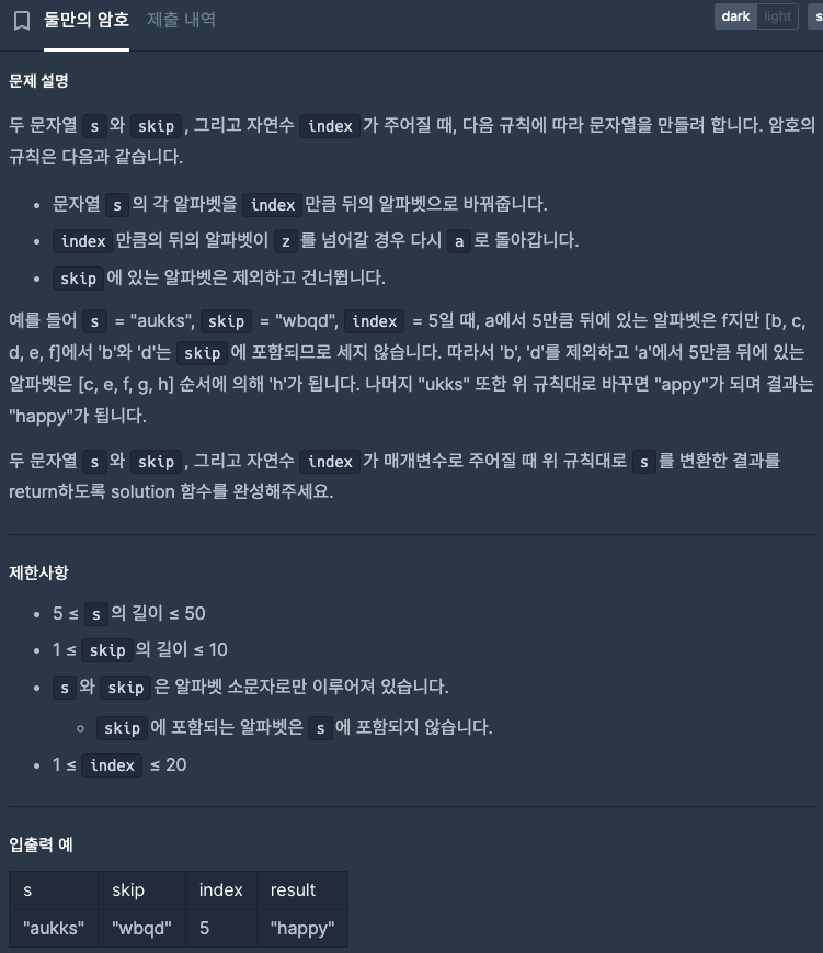 5. i에 index 값을 더하여 새로운 j를 구하는데 z인덱스를 넘어가면 a인덱스로 넘어가야 하기 때문에 count로 나눈 나머지 값을 할당해준다. (처음에 (i!+index) - count로 해줬다가 두바퀴 돌았을 때 런타임 에러가 났다.)