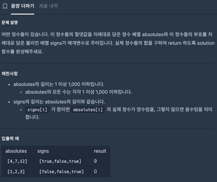 2. n번째 signs의 값이 true라면 i번째 absolutes의 값을 result에 더해준다