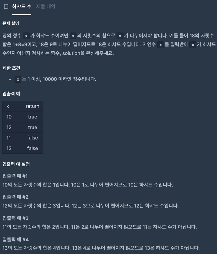 3. x를 sum으로 나눠 나온 나머지 값이 0이면 true를, 0이 아니면 false를 반환한다.