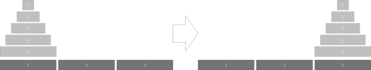 세 개의 장대가 있고 첫 번째 장대에는 반경이 서로 다른 n개의 원판이 쌓여 있다. 각 원판은 반경이 큰 순서대로 쌓여있다. 이제 수도승들이 다음 규칙에 따라 첫 번째 장대에서 세 번째 장대로 옮기려 한다.